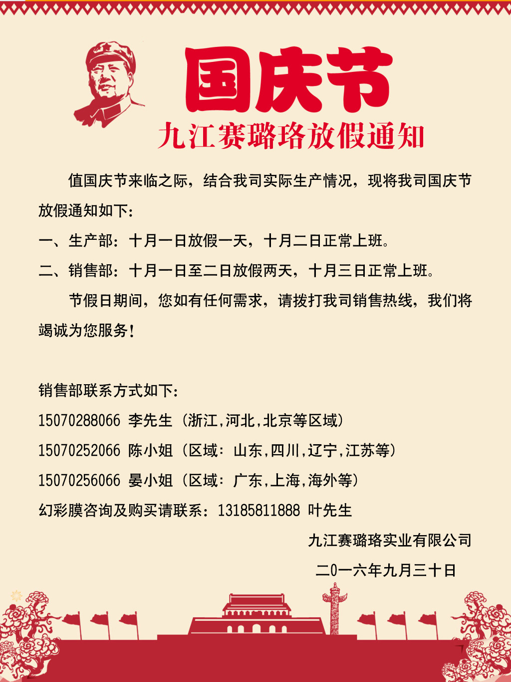 值國慶節(jié)來臨之際,結(jié)合我司實際生產(chǎn)情況,現(xiàn)將我司國慶節(jié)放假通知如下:
