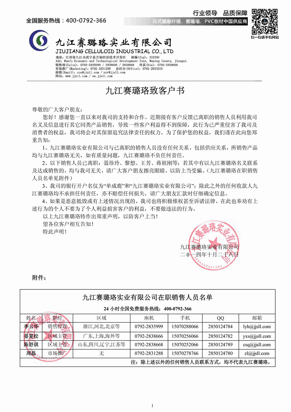 2、以下銷售人員已離職:聶珍玲、黎想、王芳、蔣祖剛等;若其中有以九江賽璐珞名義聯(lián)系及達(dá)成銷售的,均與我司無(wú)關(guān),請(qǐng)廣大客戶朋友擦亮眼睛,以防上當(dāng)受騙。(九江賽璐珞在職銷售人員名單見附件)