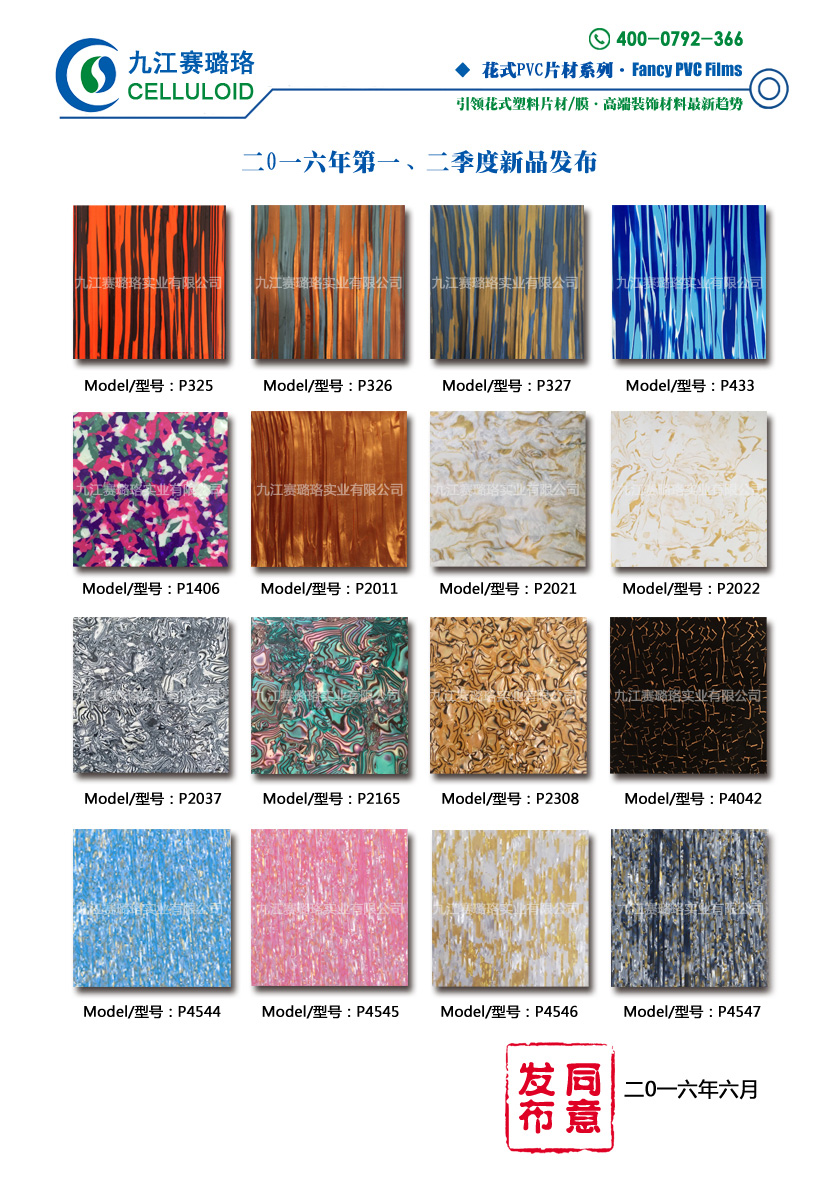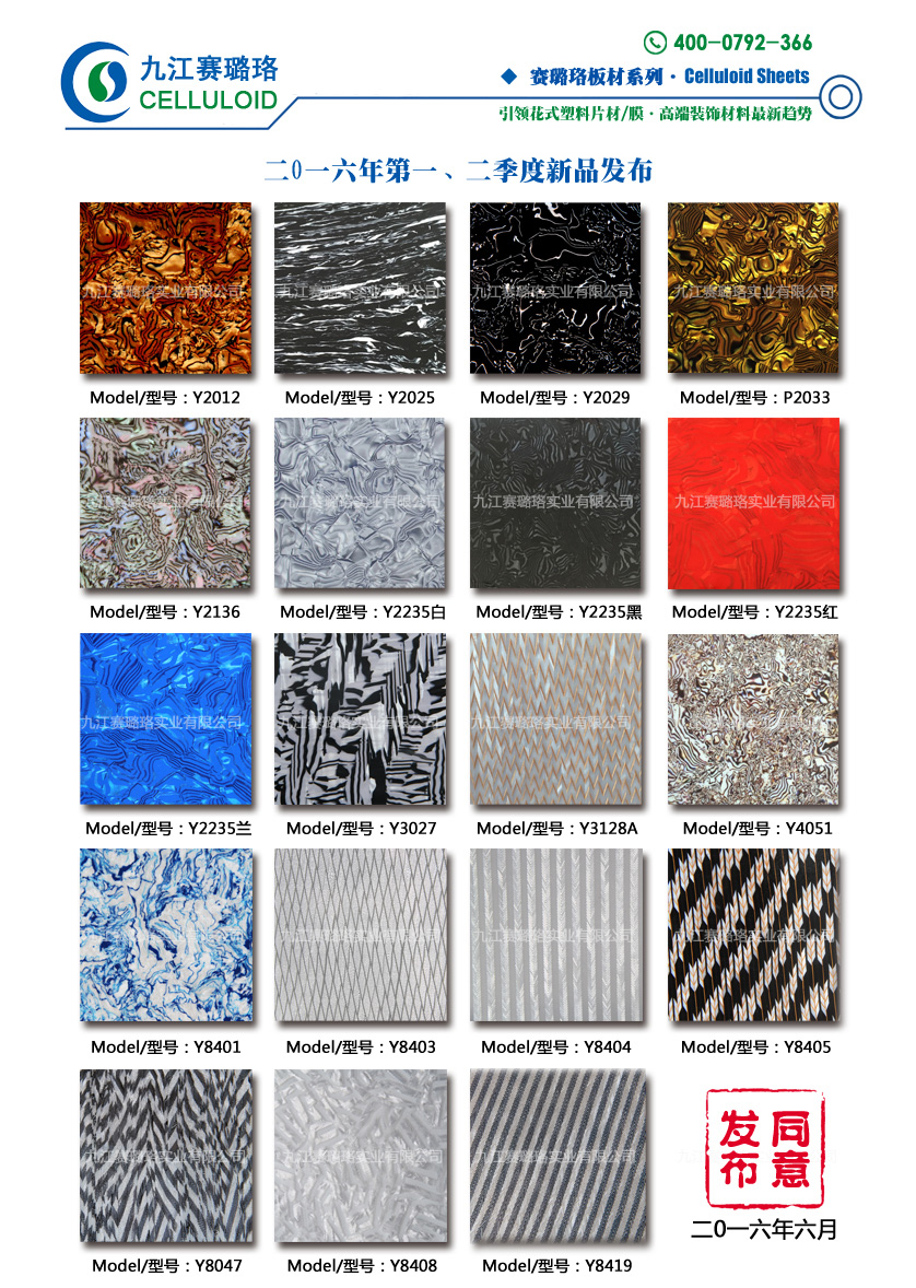 九江賽璐珞實(shí)業(yè)有限公司2016年第一、二季度賽璐珞板材、瑪瑙膜、理石膜、樂(lè)器裝飾材料、花式PVC片材新品發(fā)布,引領(lǐng)花式塑料片材/膜·高端裝飾材料最新趨勢(shì)。咨詢熱線:0792-2838668 / 2838666 / 2835999。