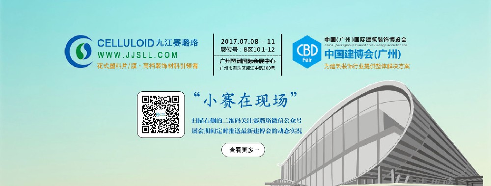 歡迎大家關(guān)注九江賽璐珞實(shí)業(yè)有限公司微信公眾號(hào),我司將參加2017年廣州建博會(huì)。我們將持續(xù)為大家?guī)斫ú?huì)最新動(dòng)態(tài),更新時(shí)間為8號(hào)-11號(hào)。每天一更!